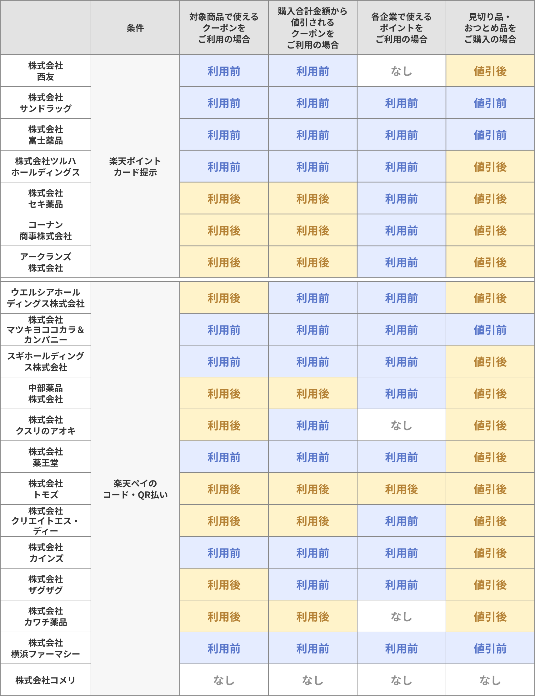 マツモトキヨシ、シメノドラッグ、ダルマ薬局、どらっぐぱぱす、ファミリードラッグ、ヘルスバンク、ミドリ薬品、くすりのラブ、matsukiyo LAB、petit madoca、ココカラファイン、ココカラファインプラスイズミヤ、クスリのコダマ、ジップドラッグ、セイジョー、ドラッグセガミ、ライフォート、岩崎宏健堂