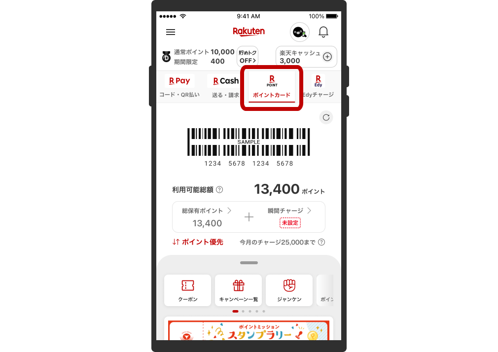 バーコードを表示[ポイントカード]をタップして、楽天ポイントカードのバーコードを表示