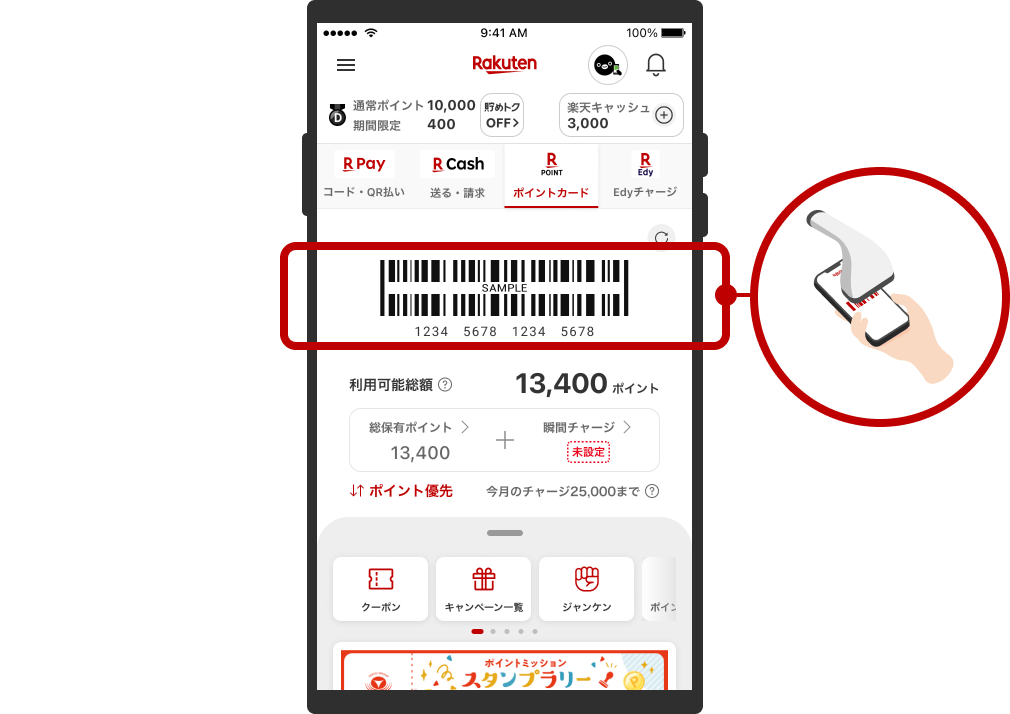 表示された楽天ポイントカードのバーコードをスタッフに提示する
